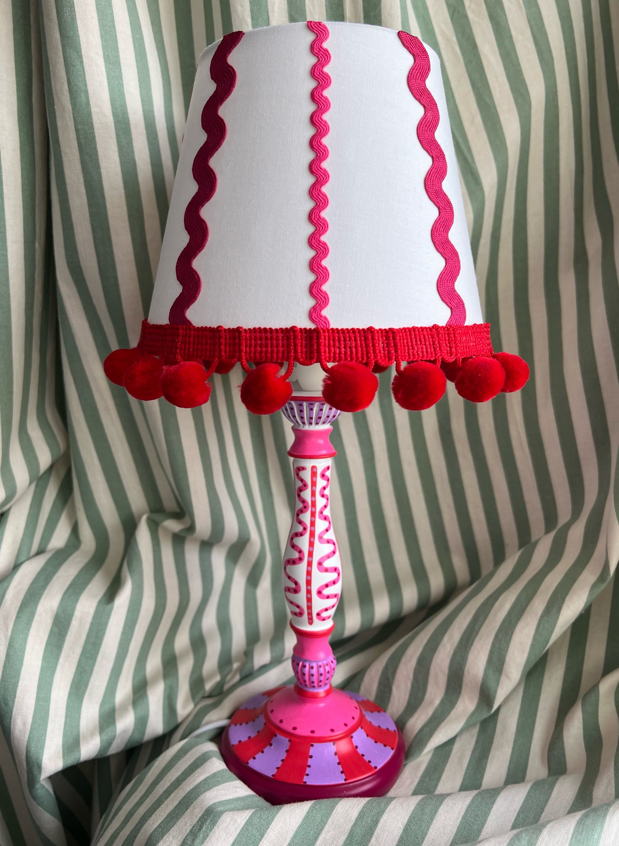 Our smallest lamp, this comes with or without its little shade. Painted in juicy pinks, red and lilac. Finished off with a pink ric rac and cherry pom pom shade.