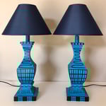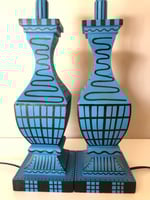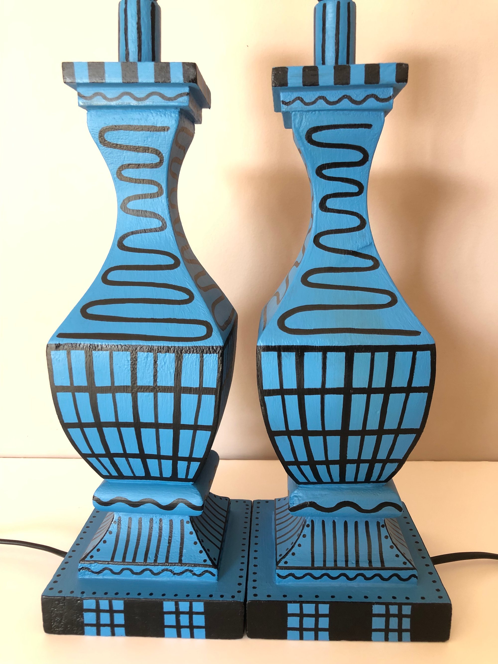 A pair of hand carved wooden table lamp bases. Hand painted in blue with a black design.