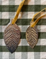 Decorative foil leaves, embossed by hand and threaded on a velvet ribbon. Choose from copper Maple, brass Oak, and silver Hornbeam or Lime