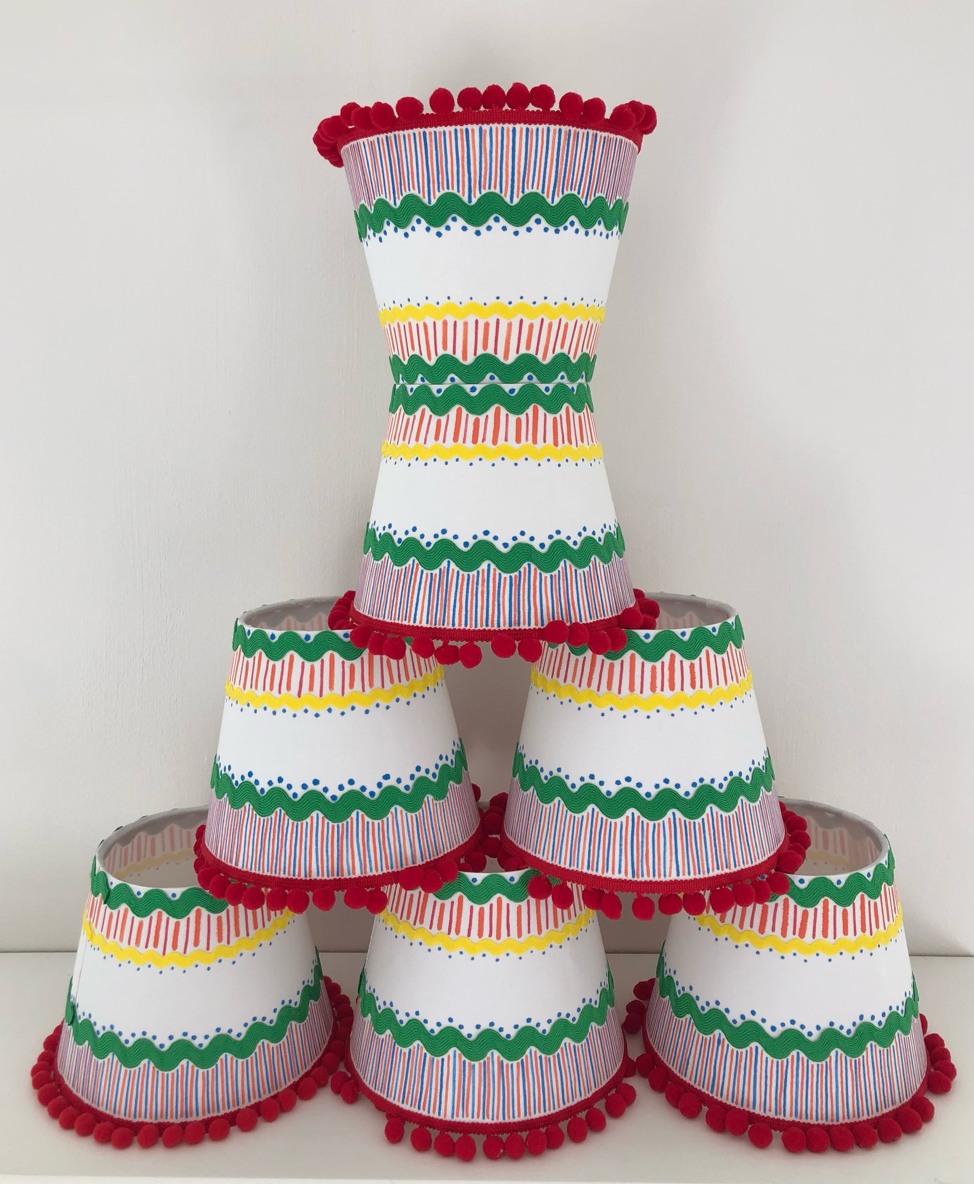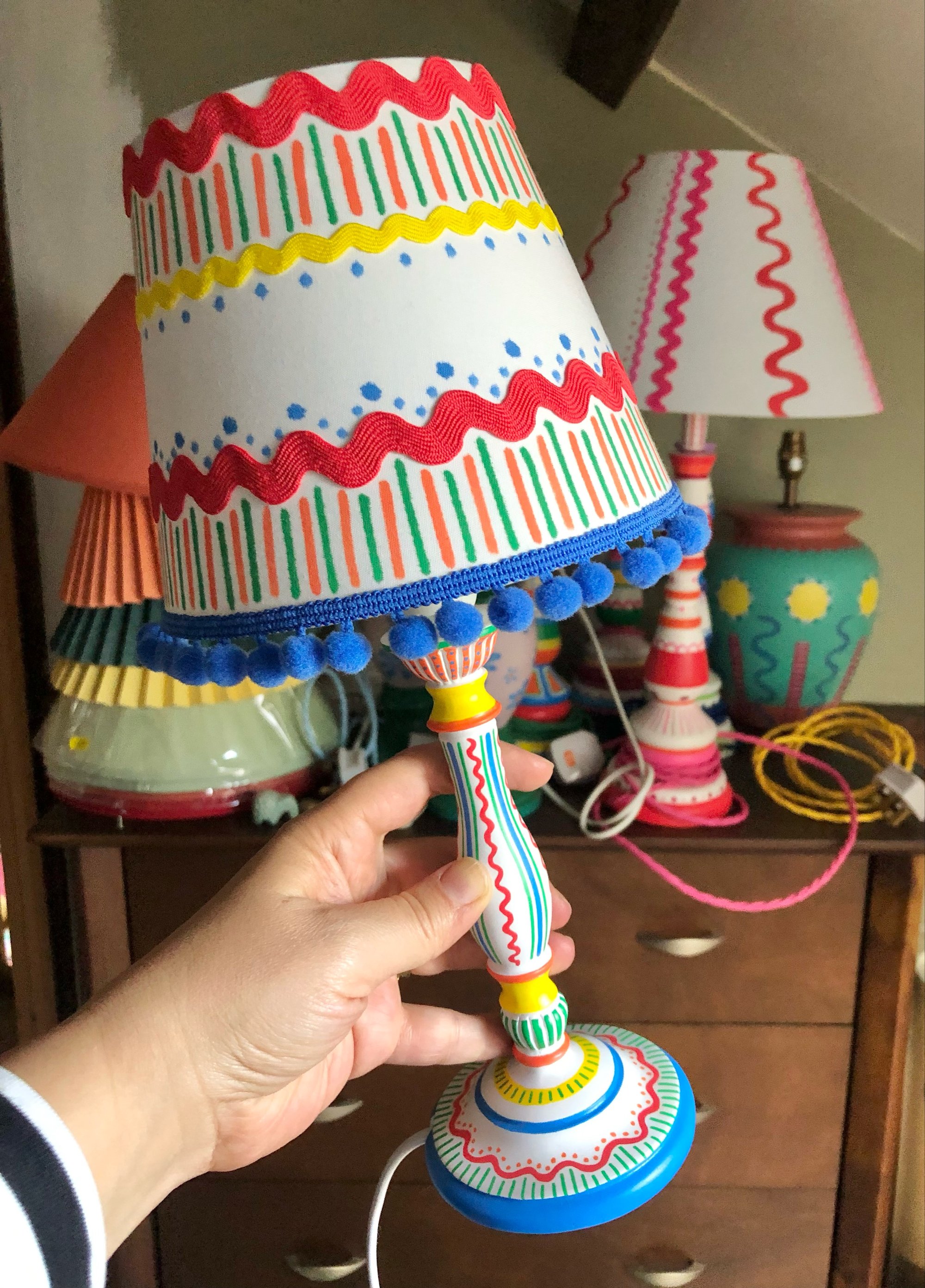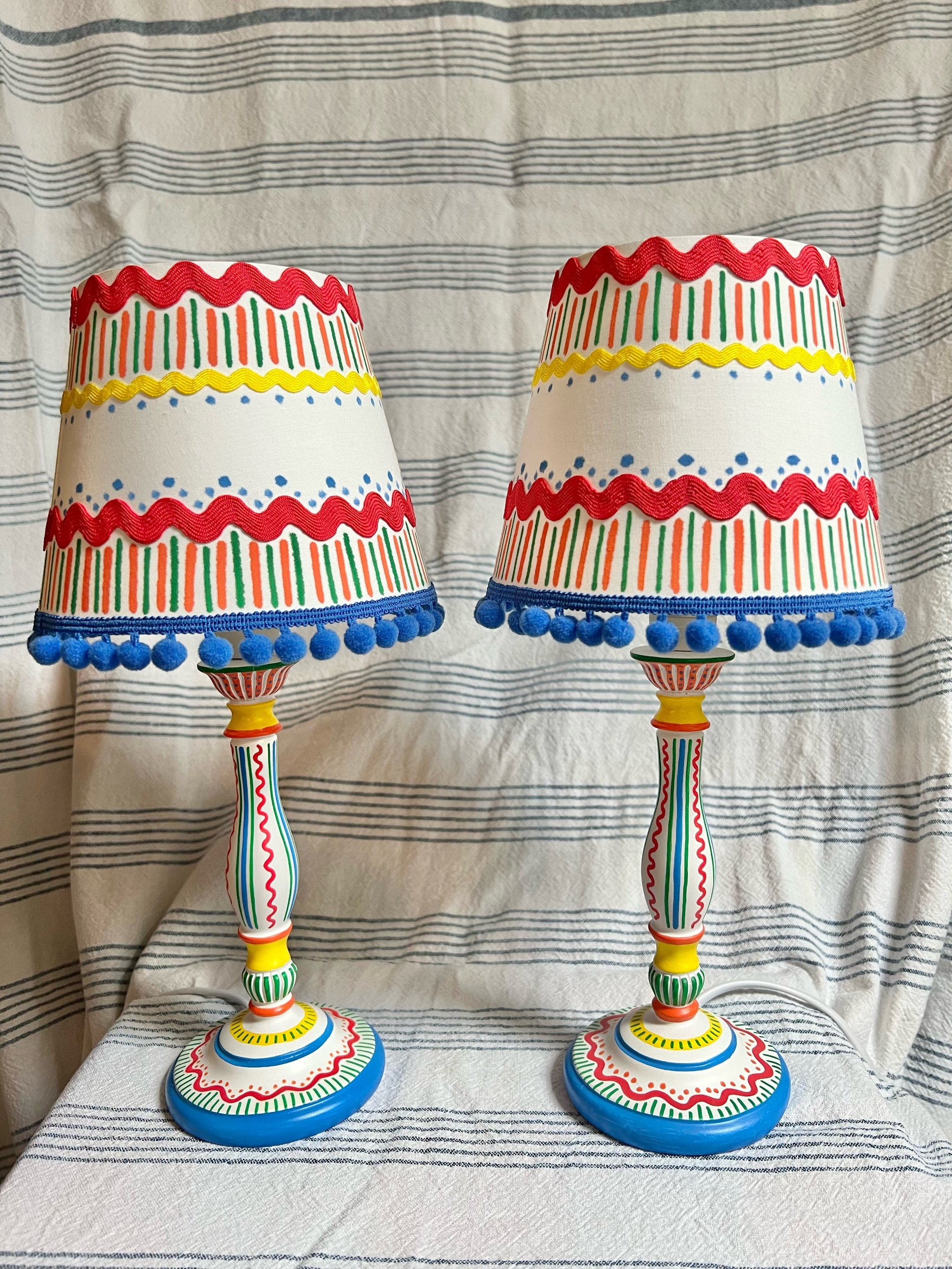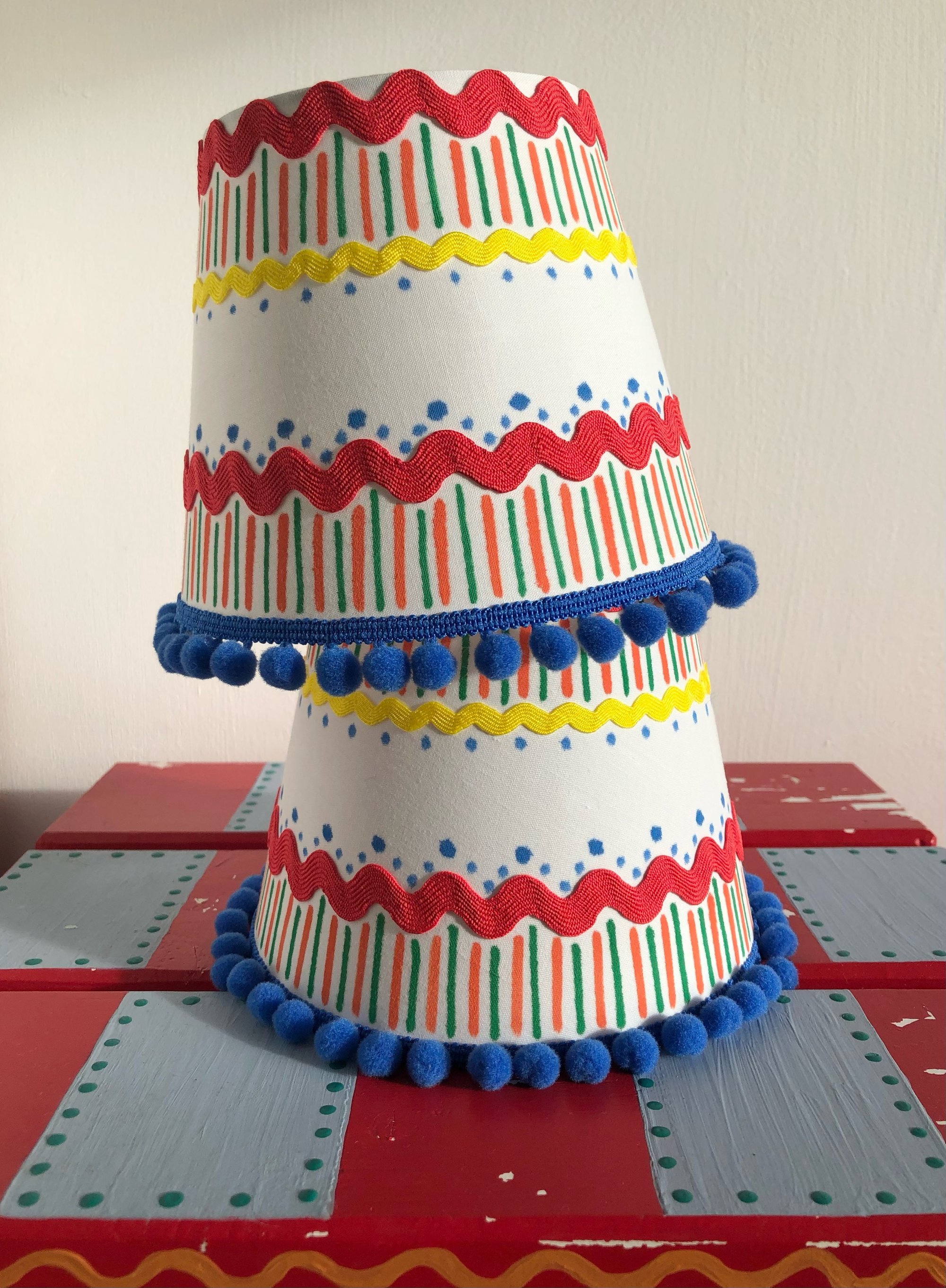 Our smallest lamp, this comes with it's little shade. Painted in bright primary colours and topped off with a handpainted, ric rac and blue pom pom shade.
