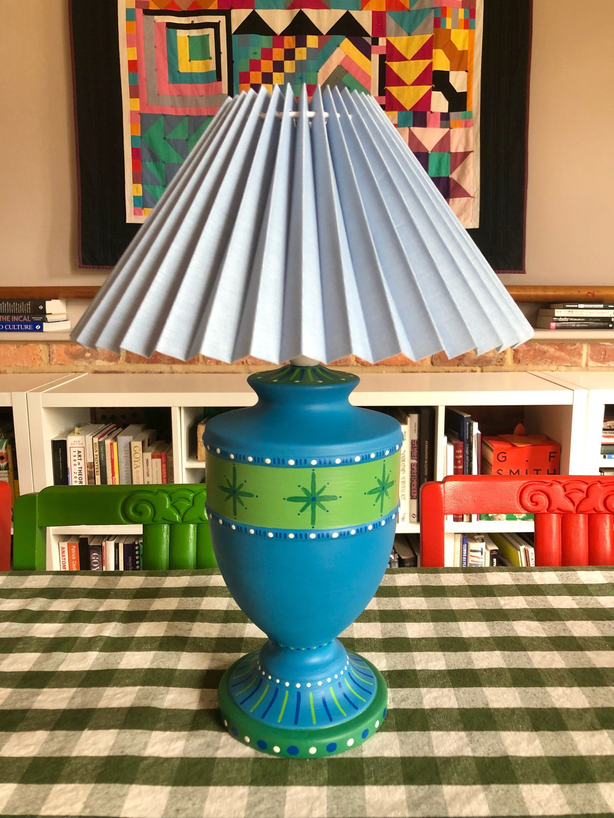 A soothing blue, urn shaped lamp stand with a pattern of green stars and white detail.