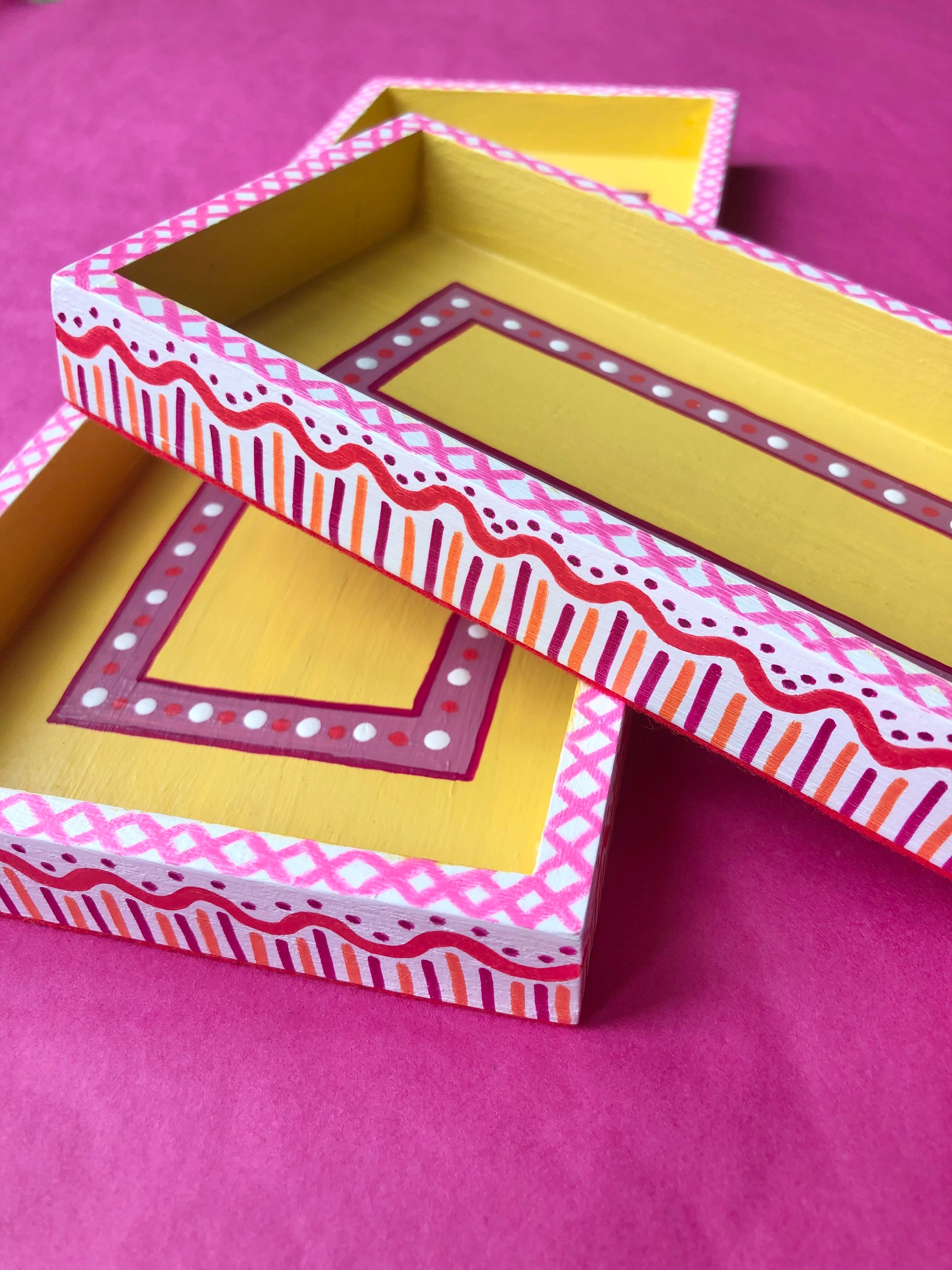 A set of hand painted, rectangular trays with a pretty pink, yellow and white pattern. Perfect for dressing tables or consoles.